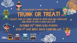 Join Trinity Church Owen Sound in Timothy Christian School’s back parking lot for a family friendly event for all ages. Visitors will walk from trunk to trunk receiving candy. When you’re finished, you can grab a hot chocolate or drop off a ballot to enter a prize draw for one of TWO huge lego sets! Where else can you collect THIS much candy in a short distance?