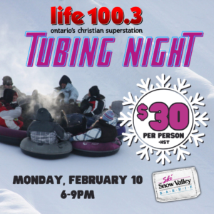 Join us for LIFE 100.3 Tubing Night at Snow Valley on Monday, February 10th. 3 hours of unlimited tubing from 6-9pm. We sold out the last two years so don’t wait to get your tickets!