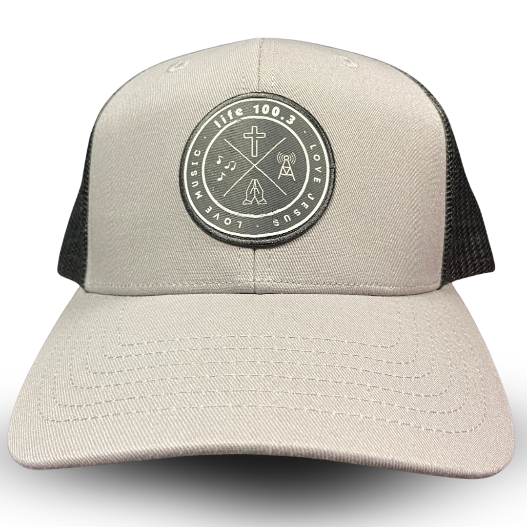 LIFE 100.3 trucker hat. Patch says “LIFE 100.3. Love Jesus. Love music. Slate grey colour with black mesh back and snapback sizing. Unisex (one size fits most).
