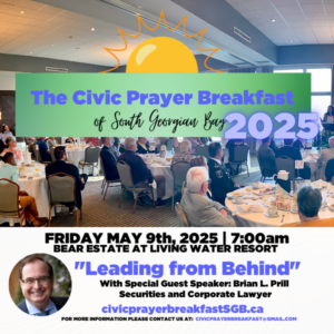 Please join us at the annual Civic Prayer Breakfast of South Georgian Bay to be held at the Bear Estate at Living Water Resort & Spa on Collingwood’s waterfront on Friday, May 9, 2025 from 7:00 am – 9:00 am (Doors open at 6:30am).