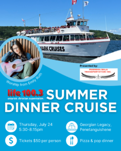 Get ready for an unforgettable evening on the water with the LIFE Summer Dinner Cruise! Join us Thursday, July 24th from 5:30 to 8:15 PM as we set sail aboard the Georgian Legacy from the Penetanguishene Town Dock and explore the many inlets and islands of Georgian Bay. On board, enjoy pizza, pop and worship music from Emily Ruth. Check in will be at 5pm, boarding at 5:15pm and we depart promptly at 5:30pm, returning to the dock at 8:15pm.