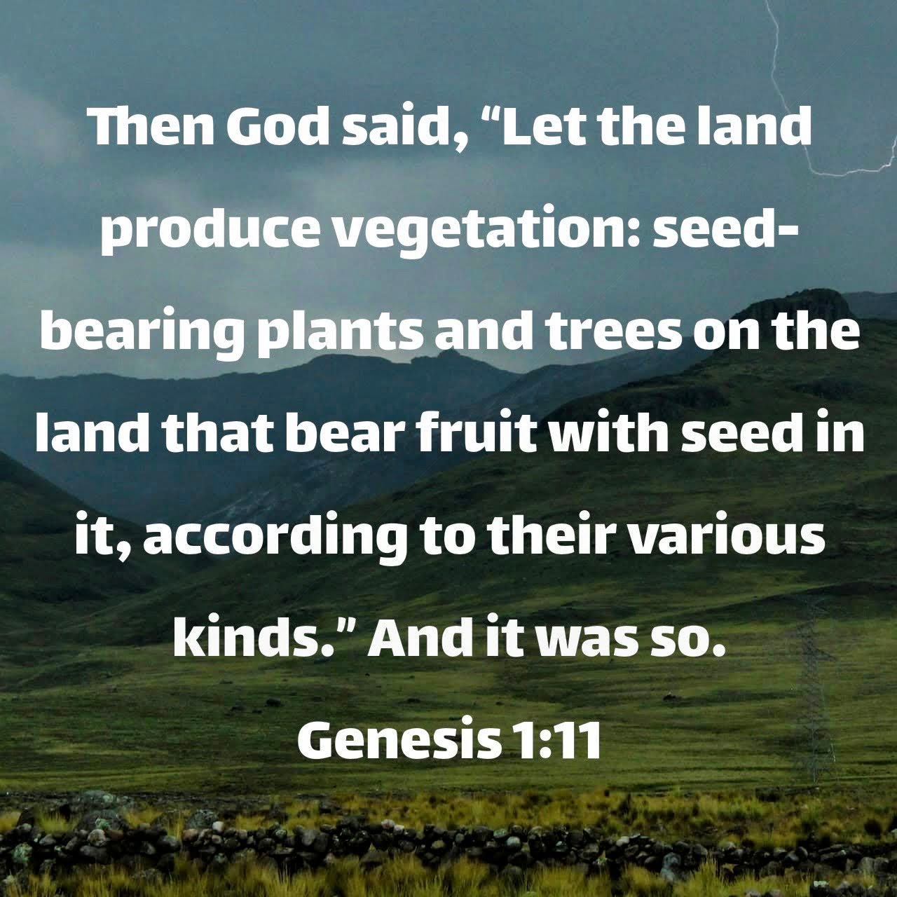 Then God said, “Let the land produce vegetation: seed-bearing plants and trees on the land that bear fruit with seed in it, according to their various kinds.” And it was so.